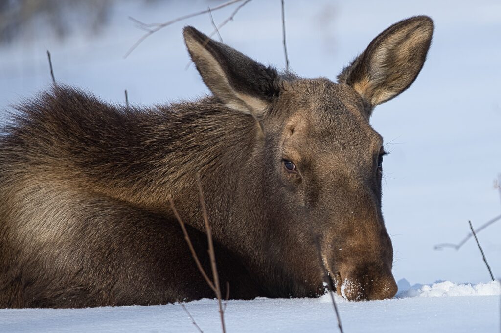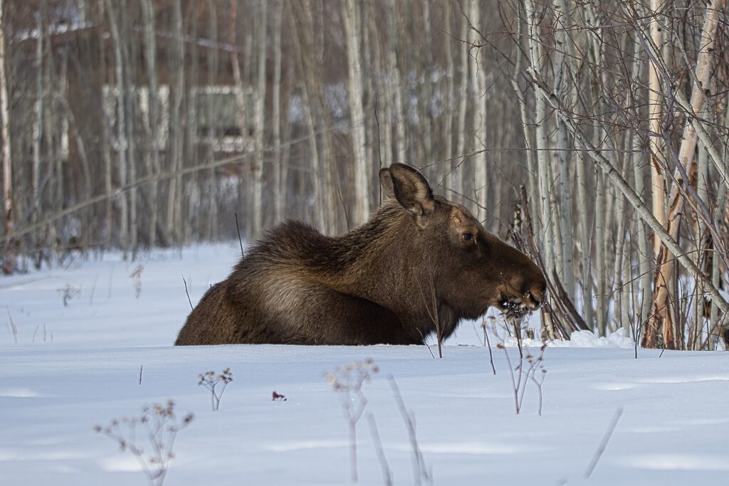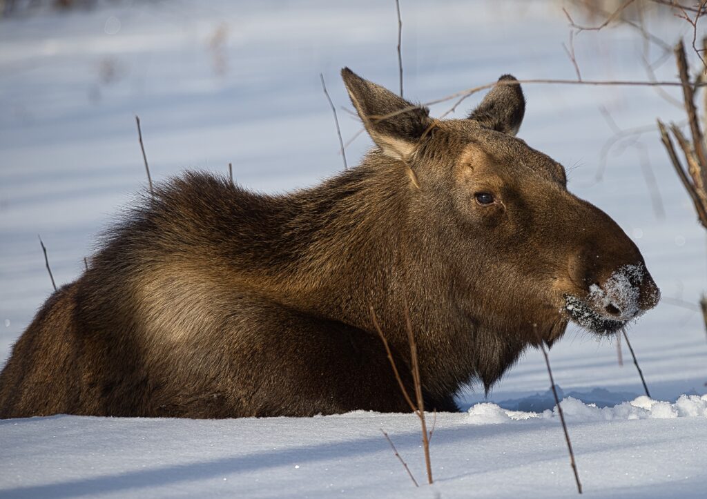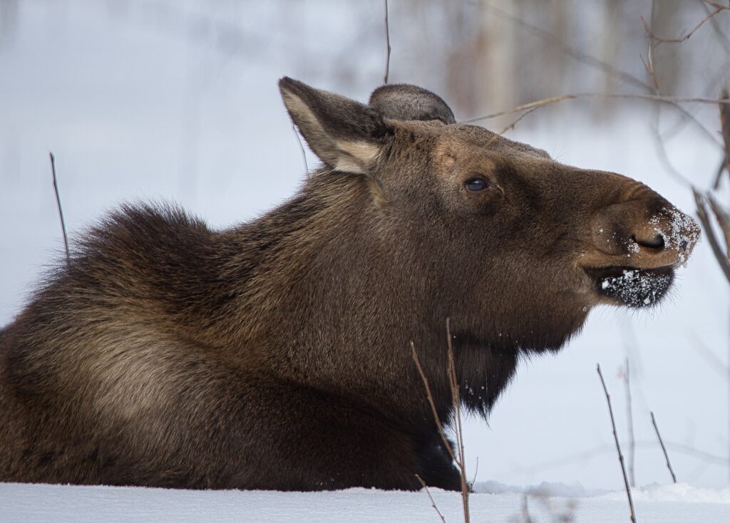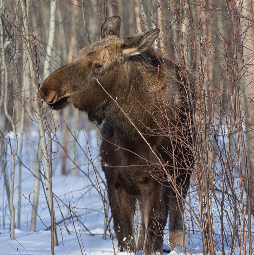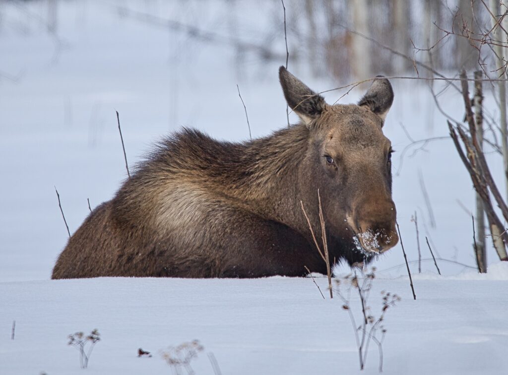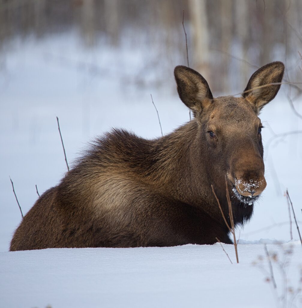 I spent over an hour sitting in the snow watching, I think she was taking a break while her 2 calves were down by the river. She sure was a beauty.