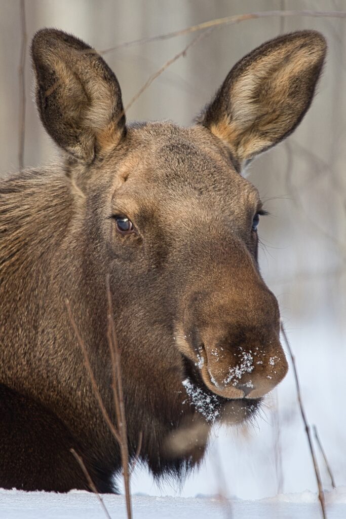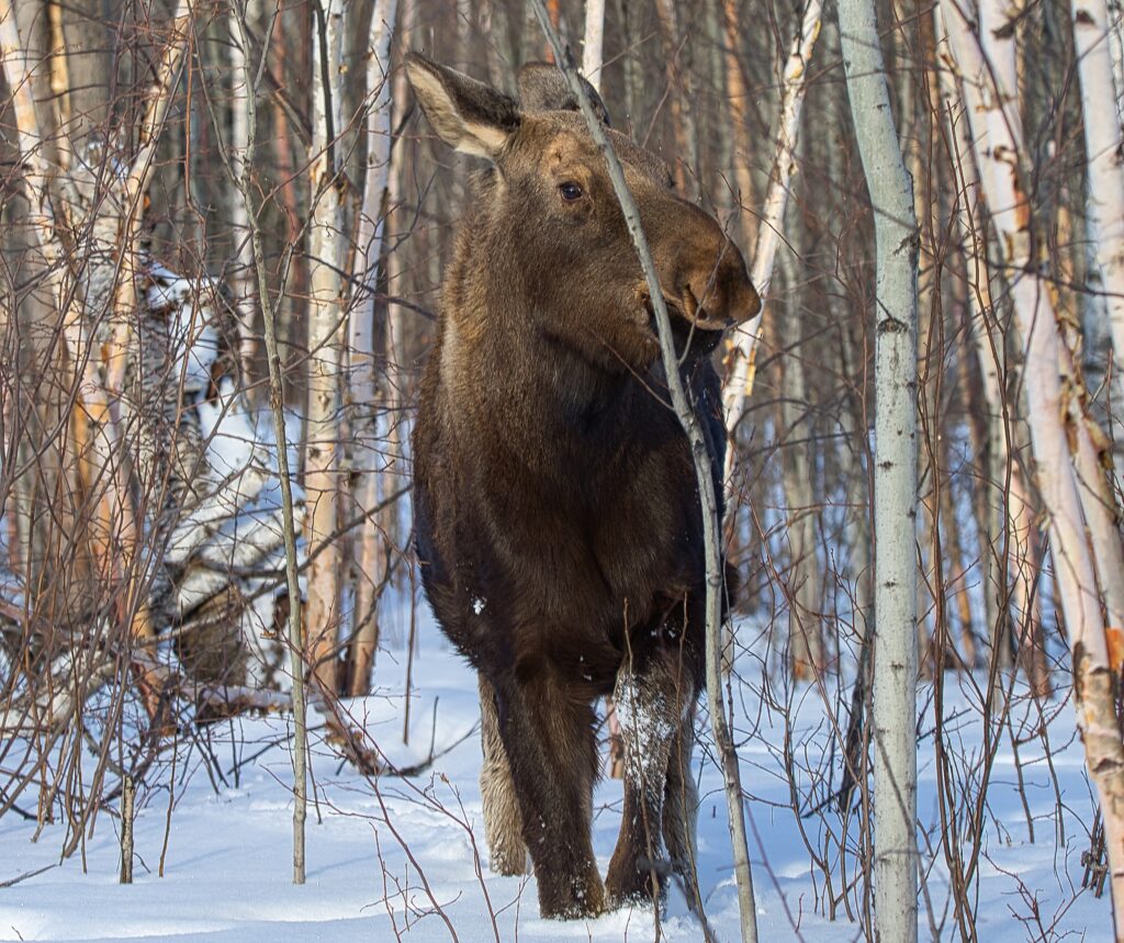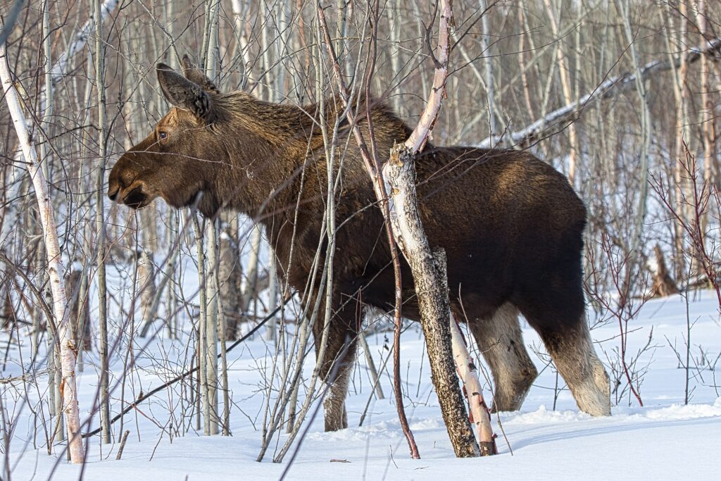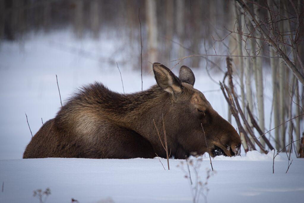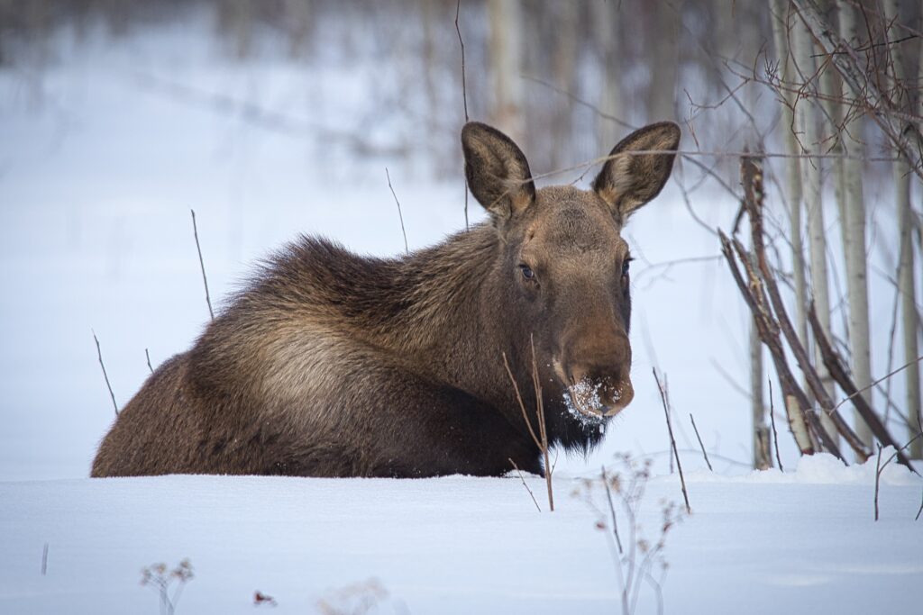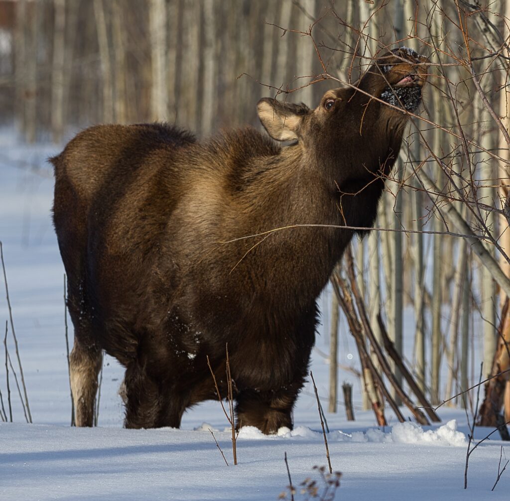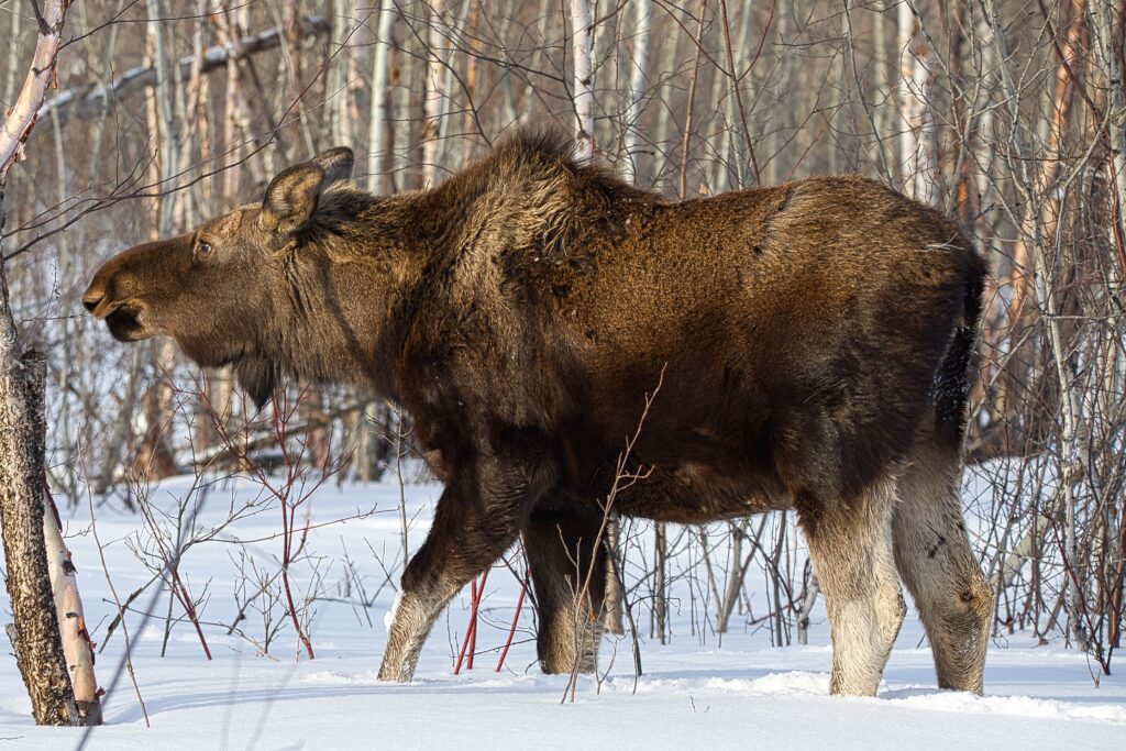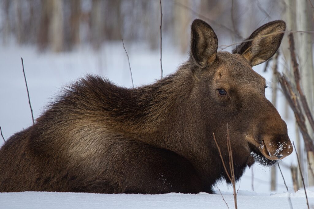 I spent over an hour sitting in the snow watching, I think she was taking a break while her 2 calves were down by the river. She sure was a beauty.
