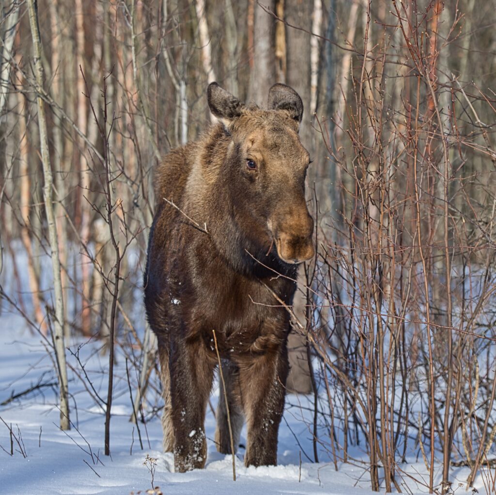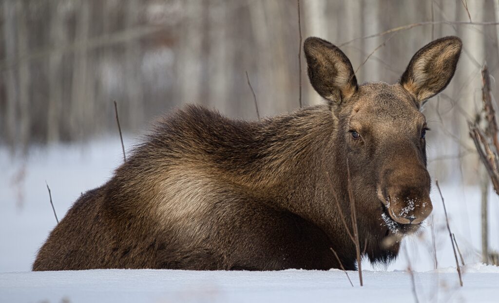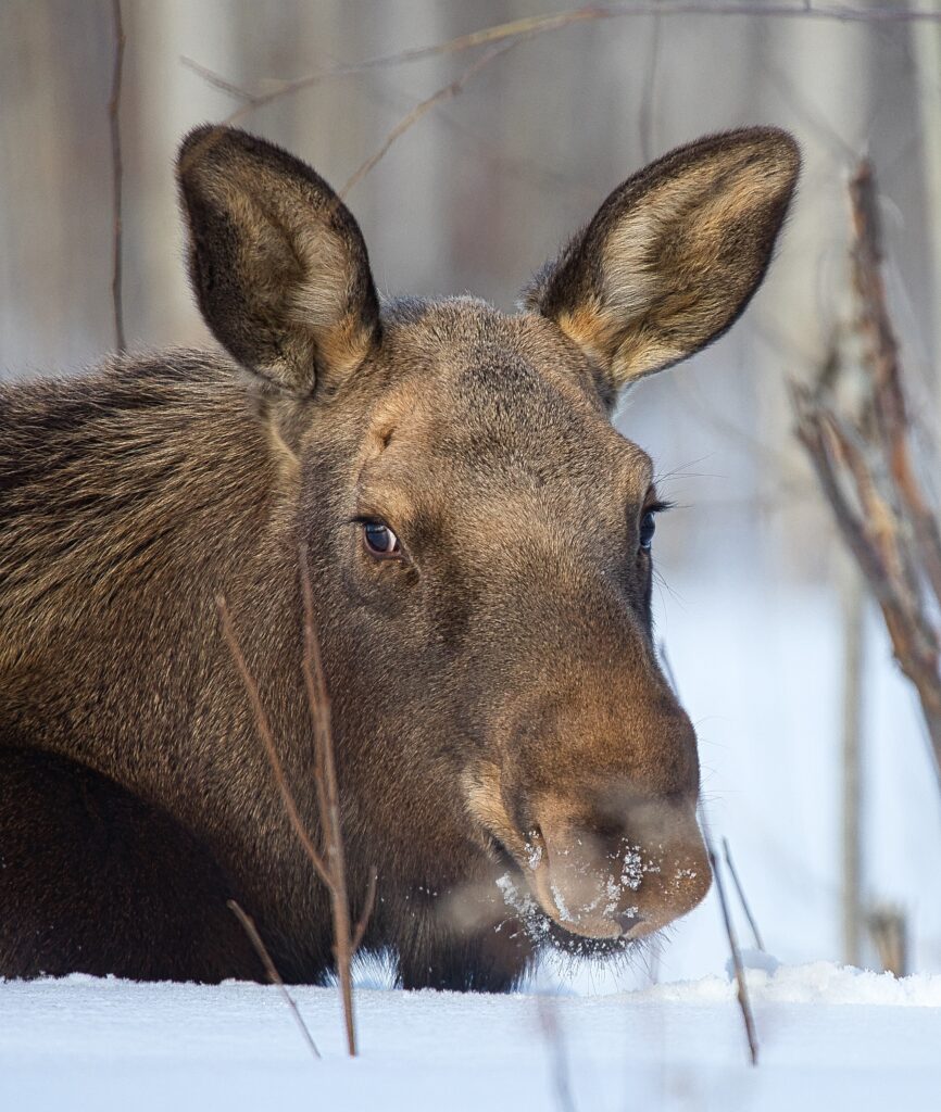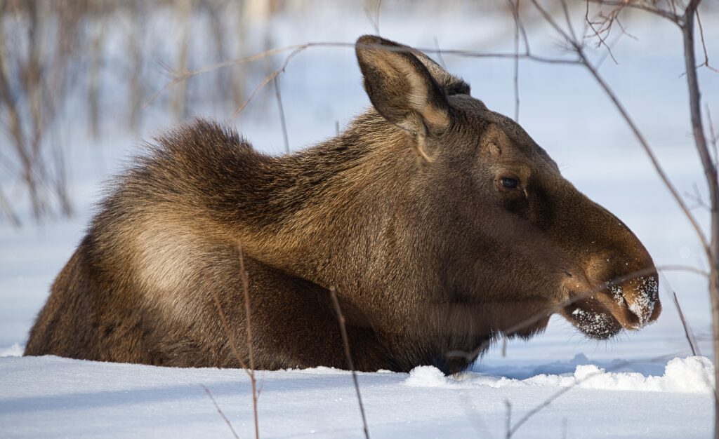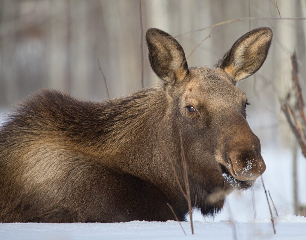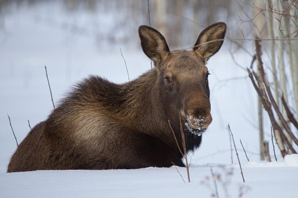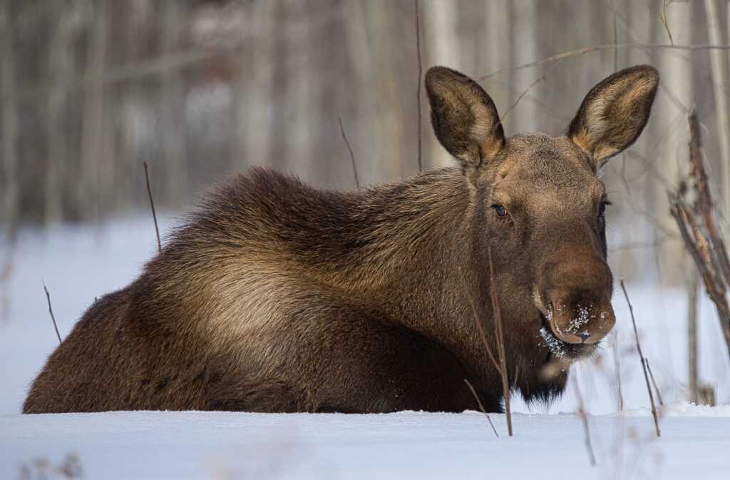 I spent over an hour sitting in the snow watching, I think she was taking a break while her 2 calves were down by the river. She sure was a beauty.
