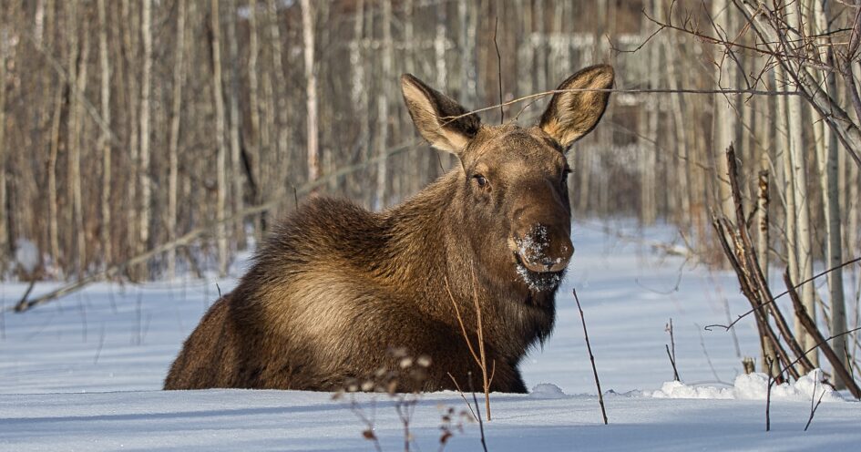 I spent over an hour sitting in the snow watching, I think she was taking a break while her 2 calves were down by the river. She sure was a beauty.